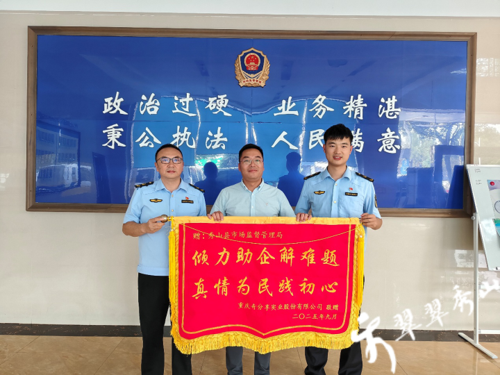 近日,重庆奇分享实业股份有限公司负责人专程来到县市场监管局,将一面印着“倾力助企解难题 真情为民践初心”的锦旗送到工作人员手中,以最诚挚的方式,感谢该局在企业办理食品生产许可证过程中的精准帮扶与高效服务。